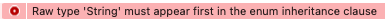 이렇게 에러가 발생한다. 해석하자면, “Raw 타입인 ‘String’은 enum의 선언부에서 첫 번째에 와야 한다."